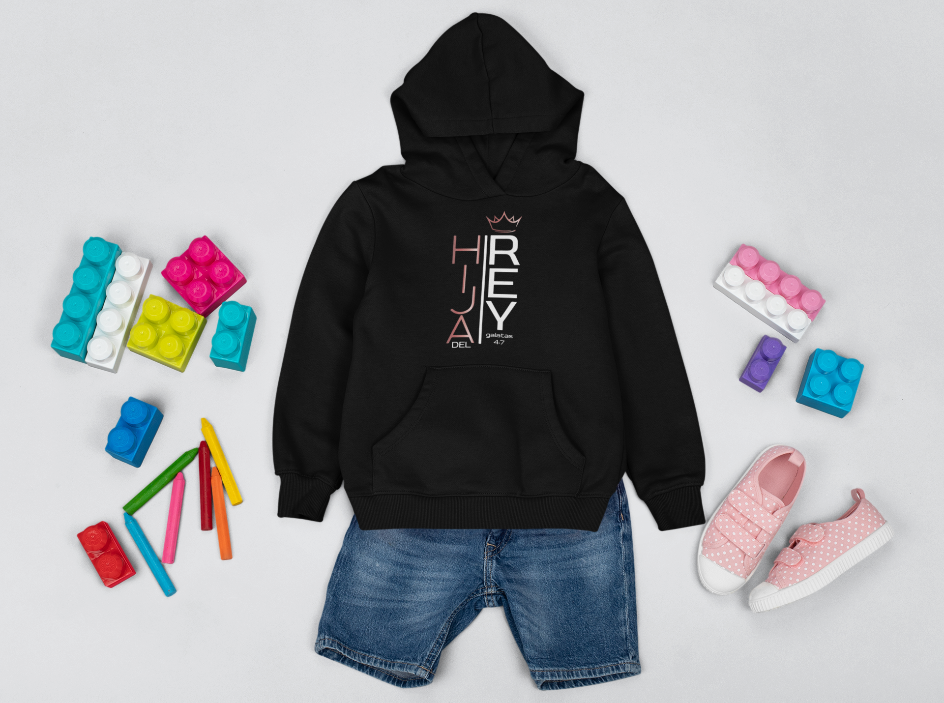 Sudadera cristiana infantil unisex, con capucha y bolsillos. Composición de algodón y poliester de alta calidad. Interior afelpado y estampada en vinilo textil.